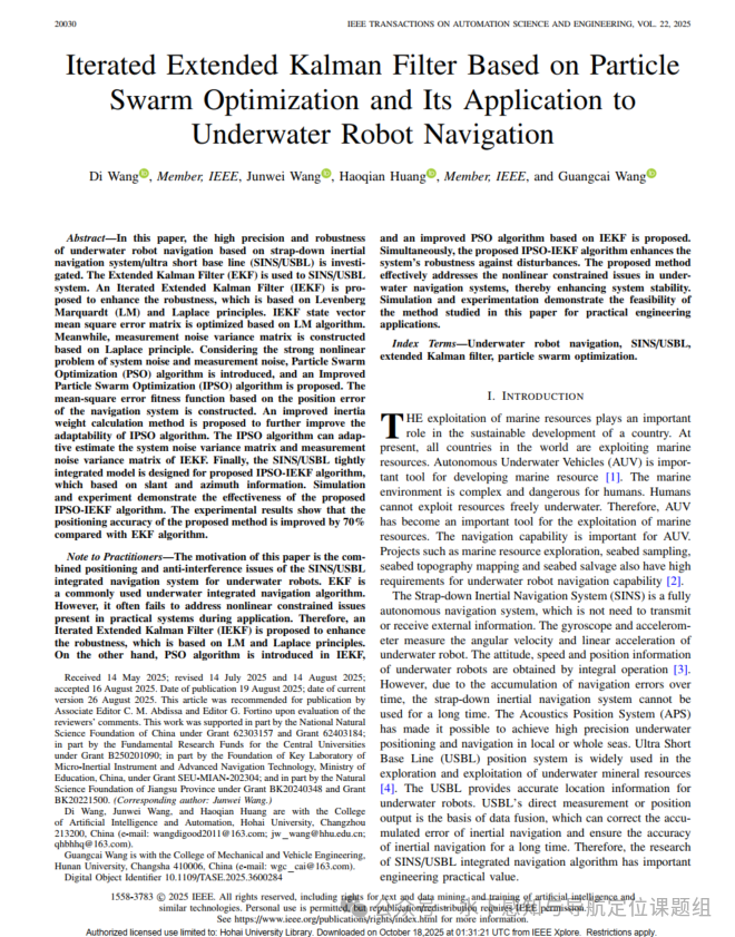 近日,学院水下感知与导航定位课题组王迪副教授的研究论文“Iterated Extended Kalman Filter Based on Particle Swarm Optimization and Its Application to Underwater Robot Navigation”(基于粒子群优化的迭代扩展卡尔曼滤波及其在水下机器人导航中的应用)以长文(Full Paper)形式录用在控制领域顶刊《IEEE Transactions on Automation Science and Engineering》(IEEE TASE)上。该论文提出了一种新颖的水下机器人SINS/USBL组合定位方案用于复杂水下场景。伟德国际victor·1946源自王迪副教授为论文的第一作者,王俊玮老师为通信作者。伟德国际1946bv为论文的第一作者单位,湖南大学为合作单位,该研究得到了国家自然科学基金等项目的资助。论文研究了基于惯性导航系统/超短基线(SINS/USBL)的水下机器人导航的高精度与鲁棒性问题。基于Levenberg Marquardt与拉普拉斯原理提出迭代扩展卡尔曼滤波器(IEKF)以增强鲁棒性。针对系统噪声与测量噪声的强非线性问题,提出改进型粒子群优化(IPSO)算法。构建基于导航系统位置误差的均方误差适应度函数,提出改进型惯性权重计算方法以进一步提升IPSO算法适应性。最终基于斜距与方位信息,为所提IPSO-IEKF算法设计了SINS/USBL紧耦合模型。仿真与实验验证了所提算法的有效性。